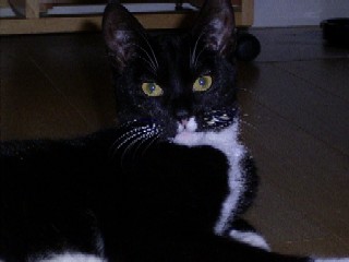 helle Augen, und ein weisser Fleck auf der Nase. Der Fleck ist durch